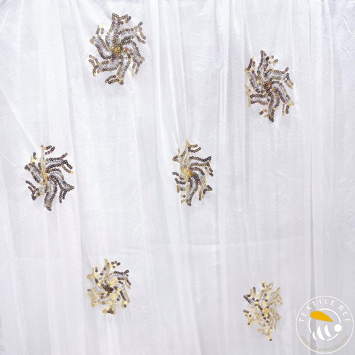 The swirling tilak pattern created with gold and silver sequins catches the light beautifully, making it perfect for daytime or night-time functions. Its lightweight yet rich texture makes it ideal for draping, layering, and styling in various creative ways. This fabric is a popular choice among decorators for use in mandap decor, entrances, photo booths, and stage backdrops.