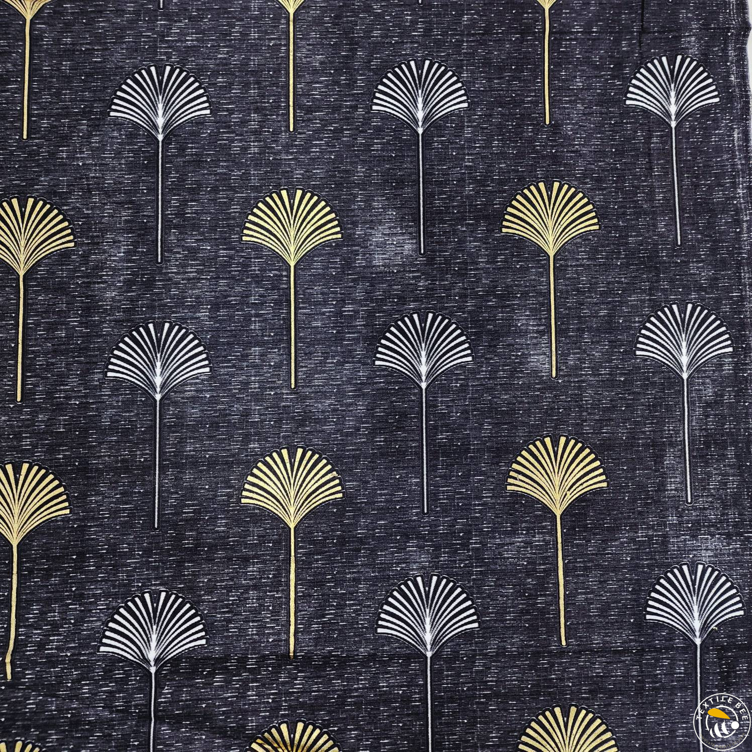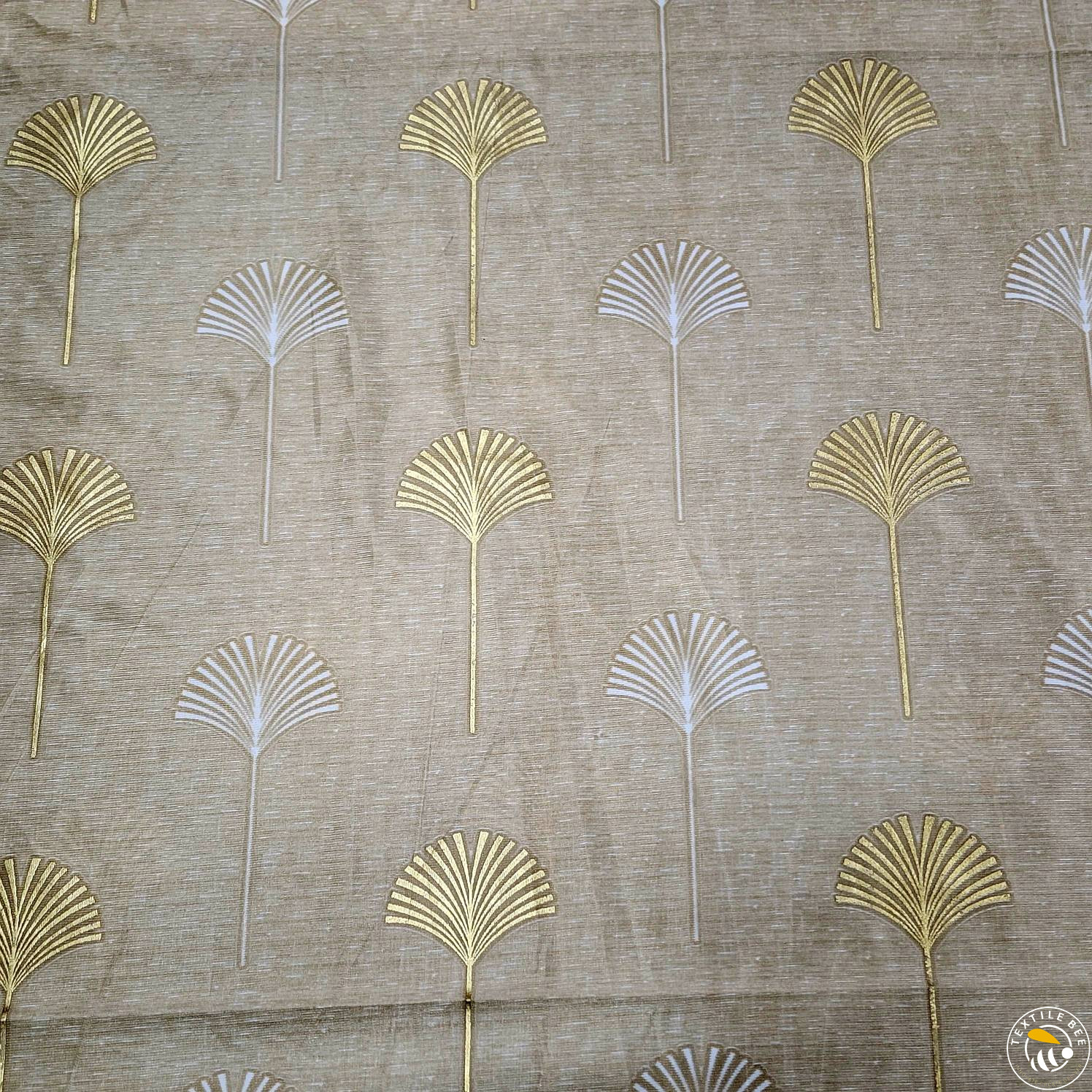 Add a touch of elegance to your décor with this Khadi fabric featuring a contemporary gold and white palm motif on a deep textured base. The design beautifully blends natural inspiration with modern aesthetics, making it perfect for sophisticated event setups. Crafted in handwoven Khadi, this fabric is ideal for backdrops, table covers, cushion covers, wall panels, and stage décor where a chic yet earthy vibe is desired.