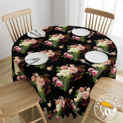 Give your events a royal and timeless look with the MOODY FLORAL VINTAGE ROSES Round Table Cover. Designed with a deep black base and blooming vintage roses in rich tones, this table cover adds elegance and sophistication to any occasion. Perfect for weddings, receptions, formal dinners, and luxury-themed décor. Available in customizable sizes to perfectly fit your round tables.