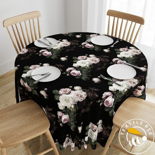 Give your events a royal and timeless look with the MOODY FLORAL VINTAGE ROSES Round Table Cover. Designed with a deep black base and blooming vintage roses in rich tones, this table cover adds elegance and sophistication to any occasion. Perfect for weddings, receptions, formal dinners, and luxury-themed décor. Available in customizable sizes to perfectly fit your round tables.