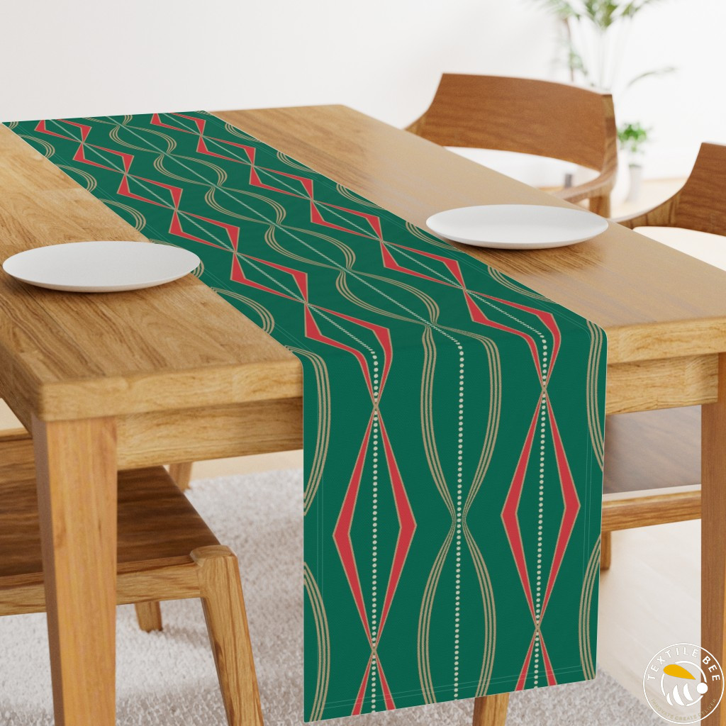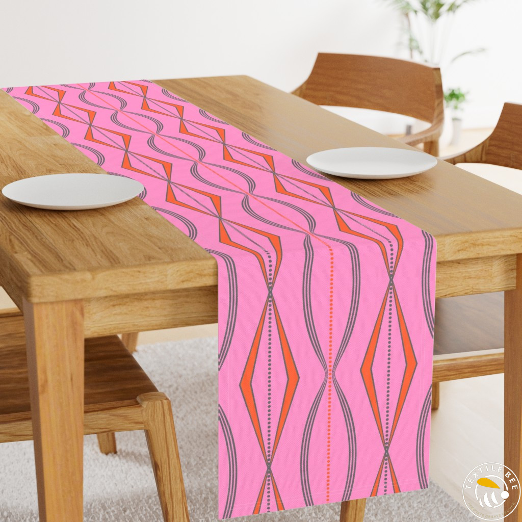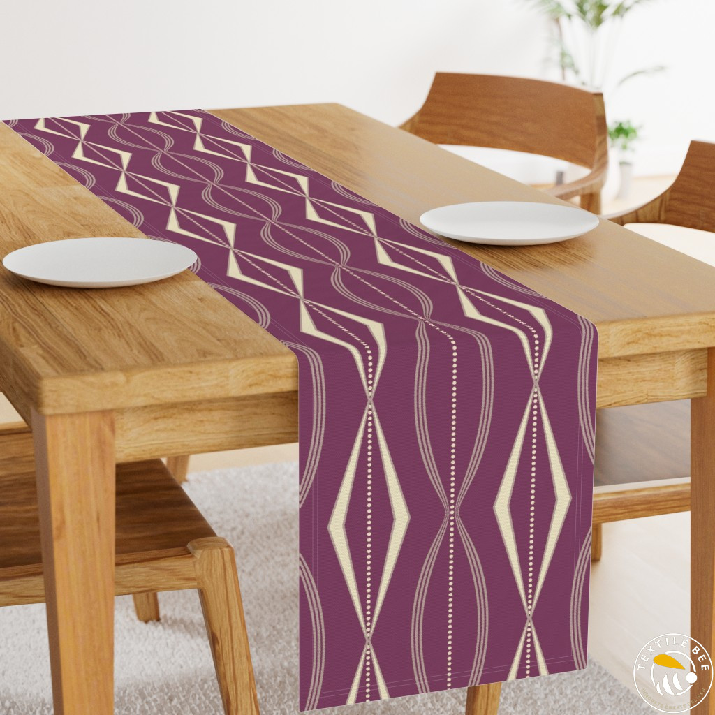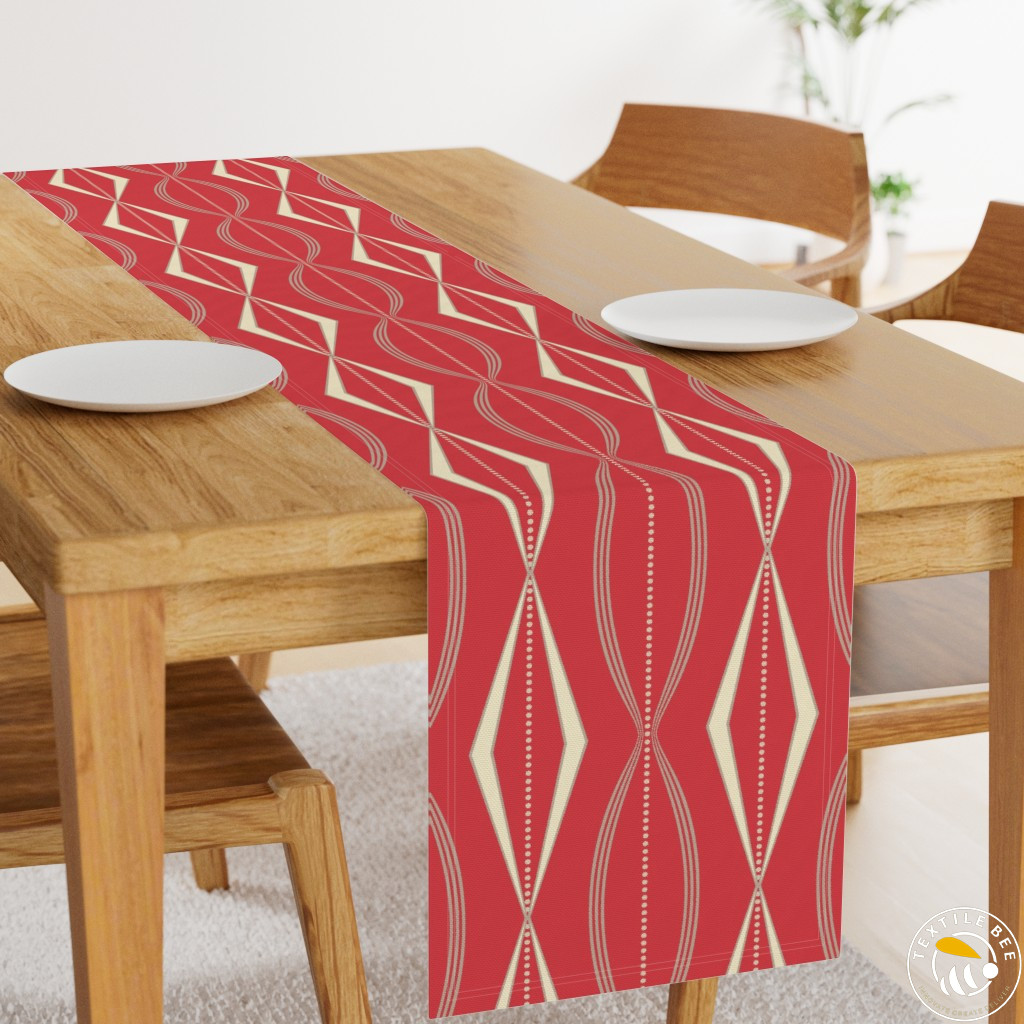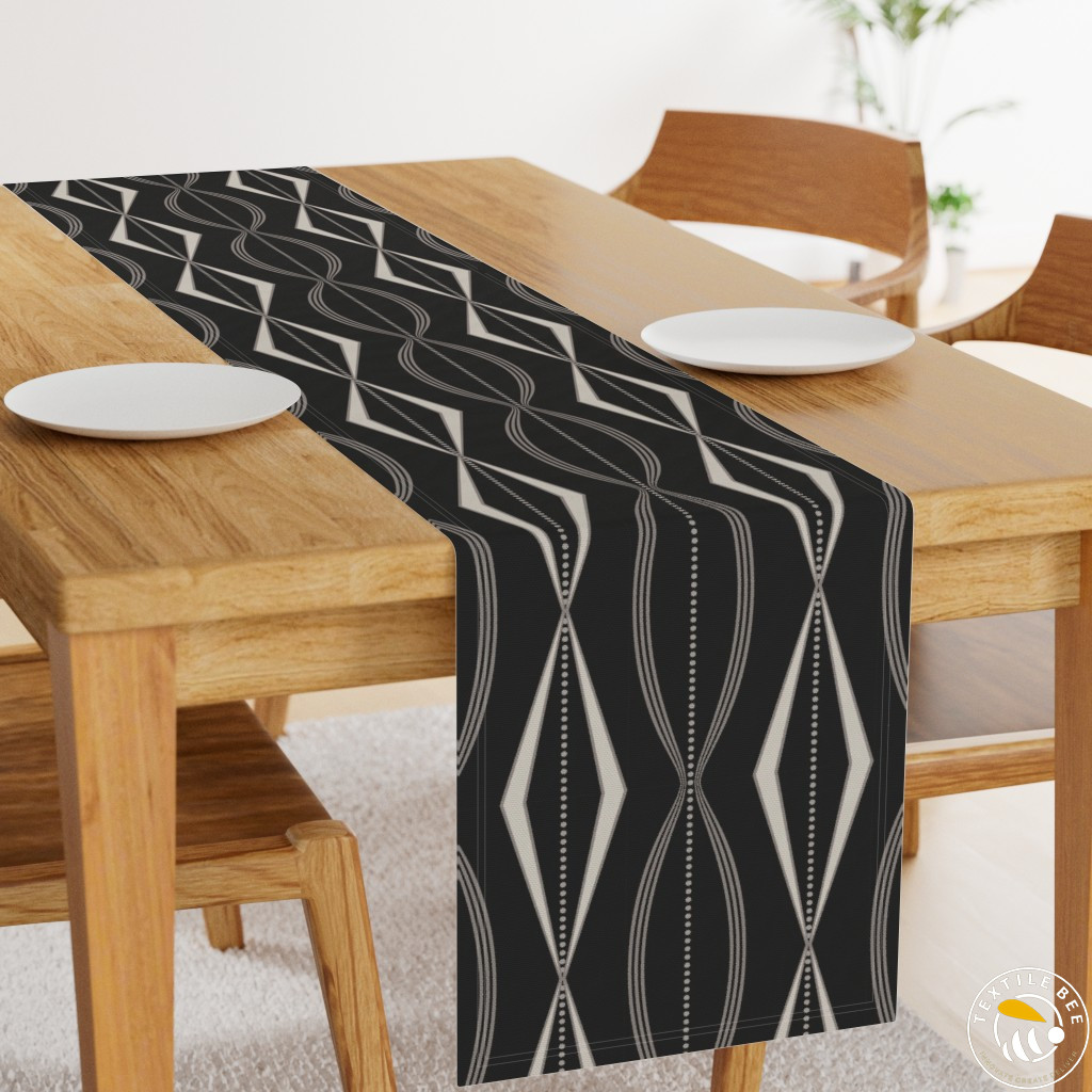 The Retro Wave Diamond Printed Table Runners feature a bold geometric pattern with elongated diamond motifs and rhythmic wave-like lines. Inspired by mid-century modern aesthetics, this design brings a vibrant and stylish edge to any dining or décor setting. Perfect for making a contemporary yet timeless statement.